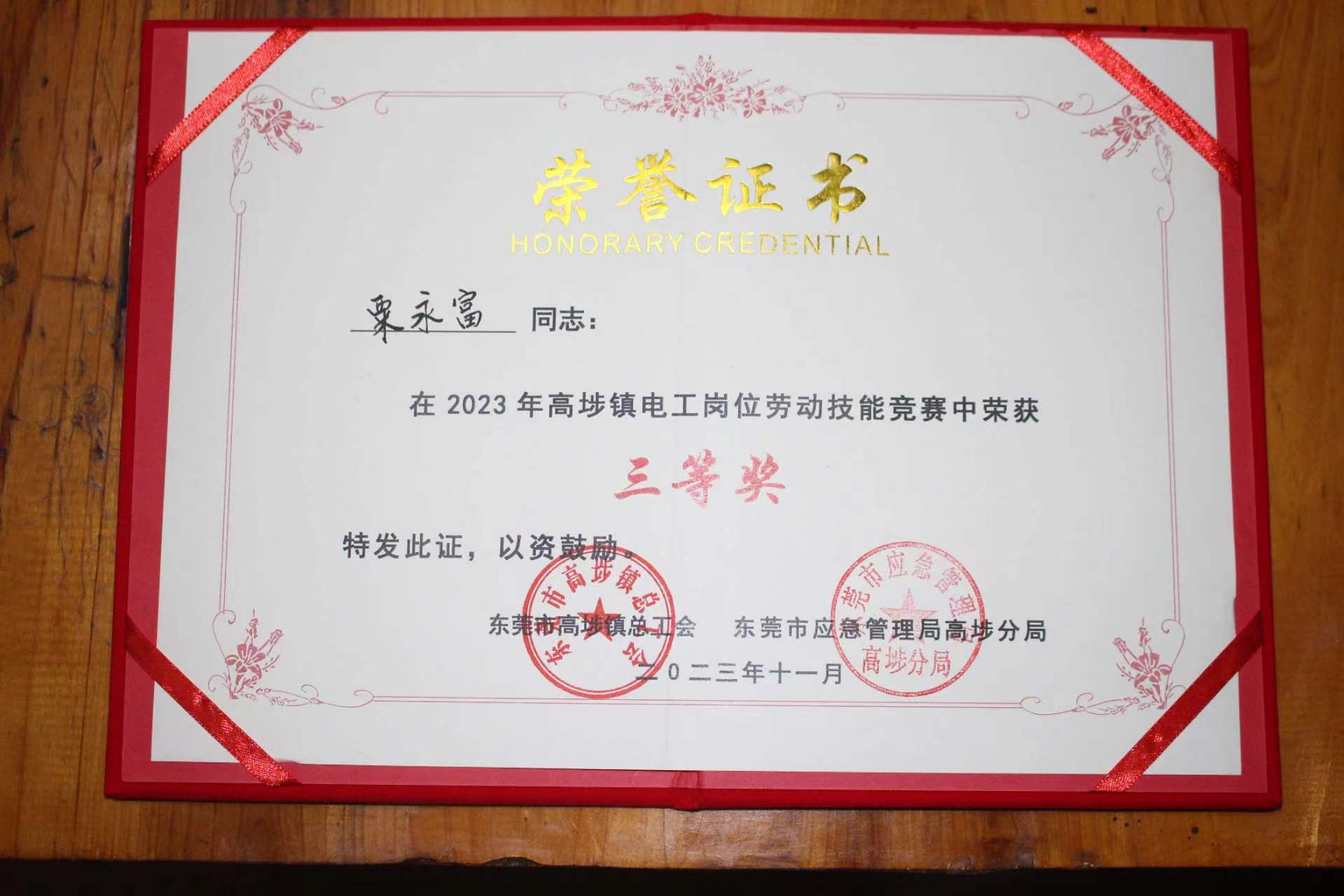 四川J9直营集团新素材科技创新有限的集团公司维修培训电工维修作业粟永富GAY得到了由市总工会组织被评为的“广州市人科技标兵”合格证及我院电工维修作业专业技能大赛金奖奖章。