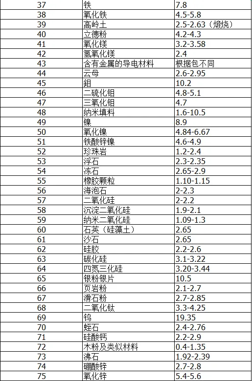 烟片、白皱片:0.98g/cm³ 硬脂酸:0.84g/cm³ 白蜡:0.9g/cm³ 松香:1.1g/cm³ 沥青混凝土:1.1g/cm³ 特制沥青路面:1.04g/cm³ 松焦油含量:1.04g/cm³ 黑油膏:1.08g/cm³ 白油膏:1.01g/cm³ 凡士林:0.88g/cm³ 磷酸氢钙:2.62g/cm³ 碳酸镁:2g/cm³ 陶土:2.6g/cm³ 岩棉、玻镁粉:2.5g/cm³ 锌钡白:4.15g/cm³ 氢氧化钾钡:4.35g/cm³ 黑云母粉:3g/cm³ 滑石粉:2.98g/cm³ 白艳华:2g/cm³ 聚酯板碳黑:1.8g/cm³ 硝酸钠:2.07g/cm³ 塑炼剂强度 硫黄粉:1.96-2.07g/cm³ VA-7:1.42-1.47g/cm³ DCP:1.082g/cm³ MOCA:1.39g/cm³ TDI:1.224g/cm³ TODI:1.197g/cm³ DMMDI:1.2g/cm³ PAPI:1.2g/cm³ DADI:1.2g/cm³ (注:硫化橡胶橡胶剂类型较多,在此仅举例说明这部分普遍硫化橡胶橡胶剂) 提高网站剂体积密度 SDC:1.30-1.37g/cm³ TP:1.09g/cm³ SPD:1.42g/cm³ CDD:1.70-1.78g/cm³ PZ(ZDMC):1.65-1.74g/cm³ EZ(ZDC):1.45-1.51g/cm³ BZ:1.18-1.24g/cm³ DBZ:1.14g/cm³ ZPD:1.55g/cm³ ZMPD:1.55-1.60g/cm³ (注:力促剂类型多,这儿仅罗列一些长见力促剂) 可溶性剂密度单位 氧化的锌:5.6g/cm³ 碳酸锌:4.42g/cm³ 钝化镁:3.20-3.23g/cm³ 碳酸镁:2.19g/cm³ 氢空气氧化钙:2.24g/cm³ 一空气氧化铅:9.1-9.7g/cm³ 四硫化三铅:8.3-9.2g/cm³ 碱式碳酸铅:6.5-6.8g/cm³ 硬脂酸:0.9g/cm³ (注:这儿硬脂酸也有所看做可溶性剂排序,但常也有所看做分散剂采用)小厨房物品硅胶圈破裂 防老剂高密度 AH:1.15-1.16g/cm³ AP:0.98g/cm³ AA:1.15g/cm³ BA:1.00-1.04g/cm³ RD:1.05g/cm³ (注:防老剂的种类多样化,前方仅罗列组成部分多见防老剂)厨卫电器硅橡胶件生产的 阻燃剂体积密度 设备油:0.91-0.93g/cm³ 化学工业凡士林:0.88-0.89g/cm³ 石蜡:0.9g/cm³ 微晶石蜡:0.89-0.94g/cm³ 页岩油沥青混凝土:1.0-1.15g/cm³ 固态古马隆:1.05-1.10g/cm³ 松煤焦油:1.01-1.06g/cm³ DBP:1.045g/cm³ DOP:0.986g/cm³ (注:阻燃剂类形较多,此地仅举例的部分常见的阻燃剂)卫生间硅胶垫圈图片大全高清大图 尤其声明公告:知识起源 天然橡胶工艺网 只供考虑,以递送非常多的信息而不纯利润。版权局归属原奈须蘑菇者。若有侵犯肖像权,请搞好关系删掉。