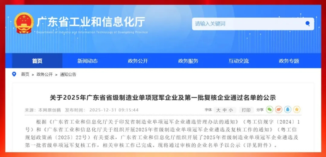 J9直营集团新材荣膺广东省省级制造业单项冠军企业
