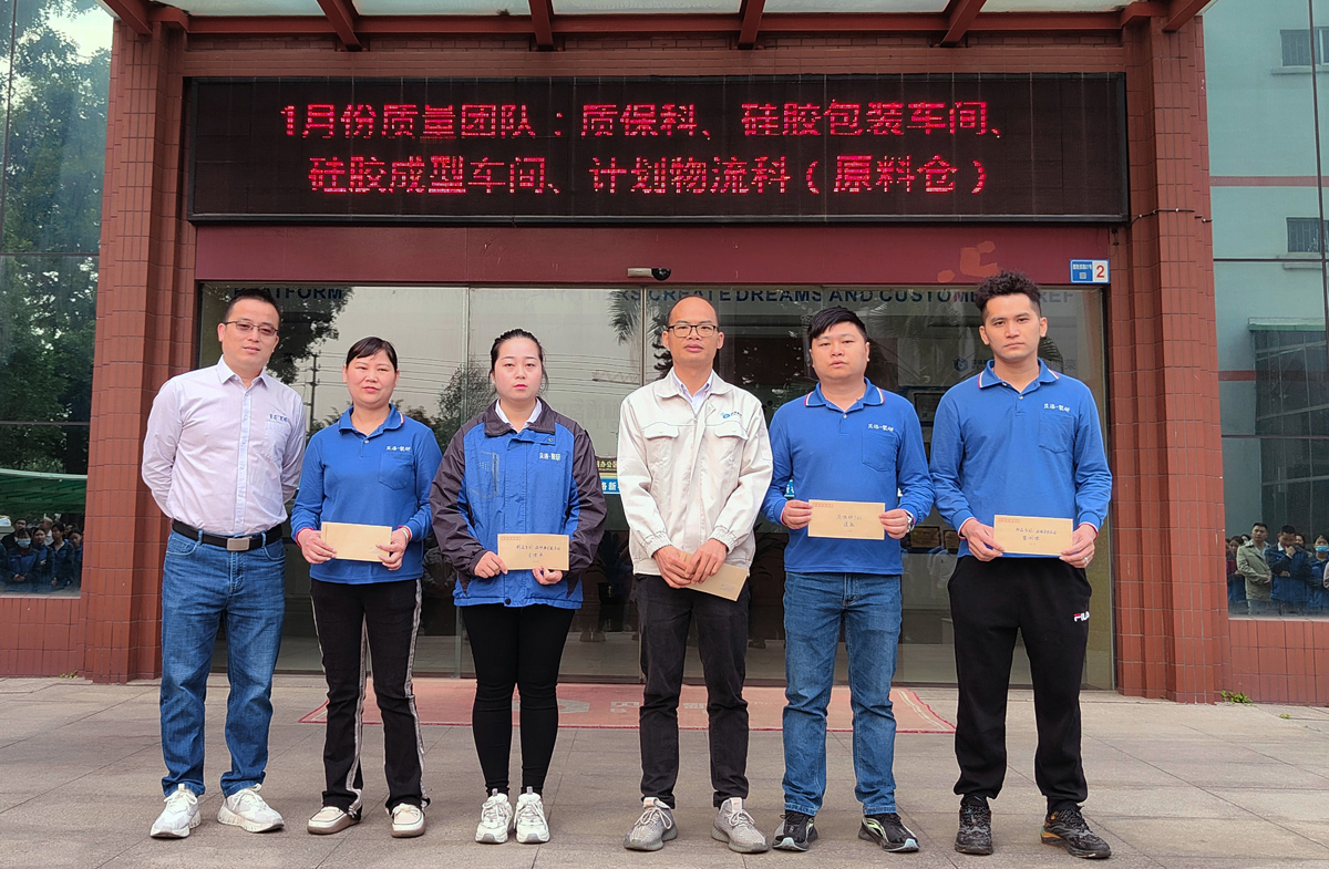 发展中心总监为质保科、硅胶包装车间、硅胶成型车间、计划物流科(原料仓)颁发了1月份“质量团队”奖金。实施“三不原则”,人人都要参与,人人都是主角,是全面质量管理(TQM)认真贯彻的要求和结果。