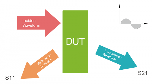 图 1: 标准波形输入DUT散射情况, 传输波形S21表示插入损耗(Insertion Loss),反射波形S11表示返回损耗(Return Loss)